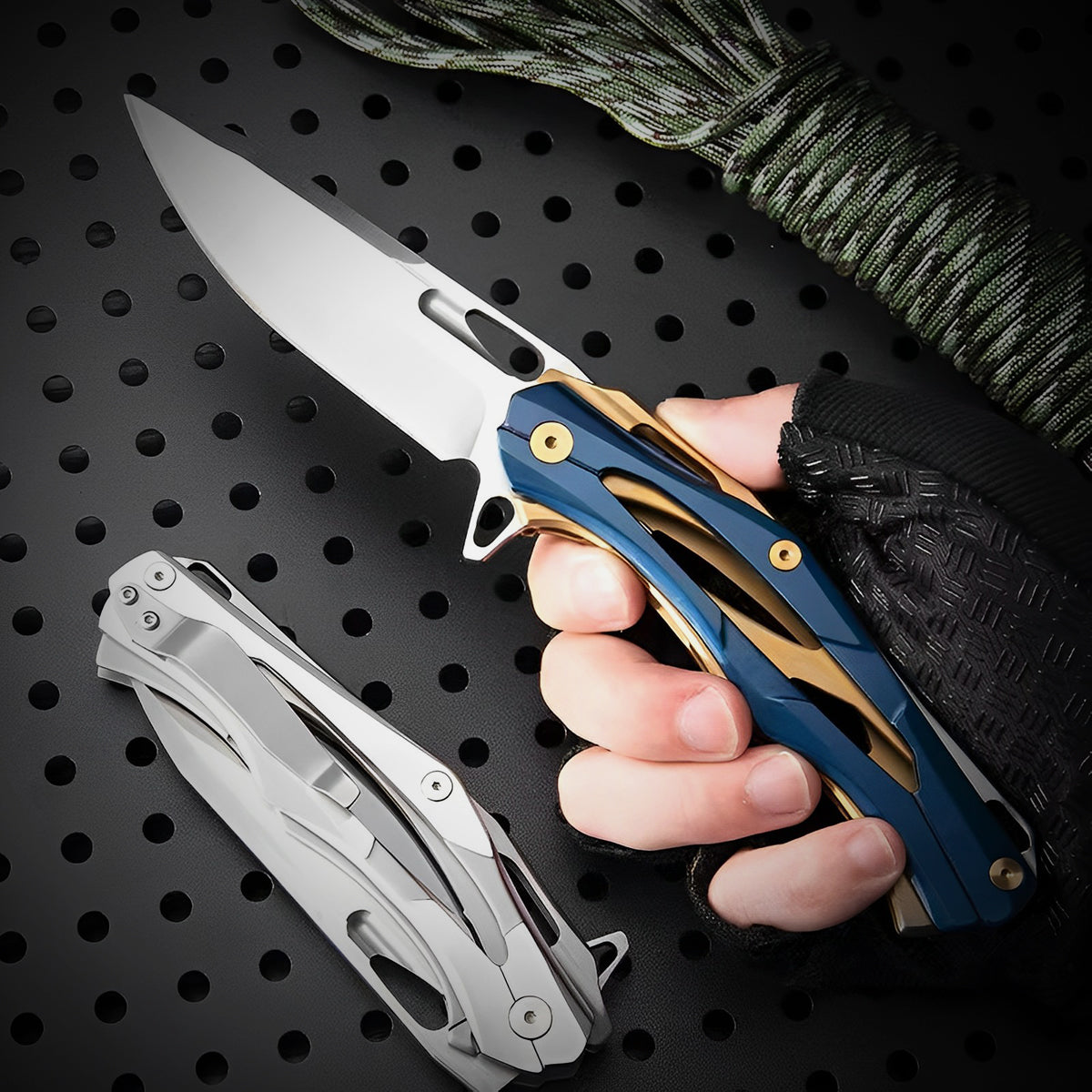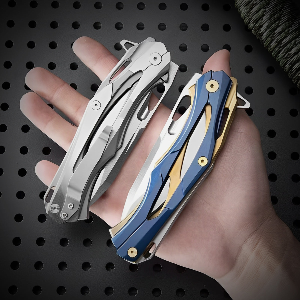 Introducing the Cybertron folding knife, a true embodiment of strength, style, and precision. With its commanding presence and captivating design, this knife stands out as one of the most remarkable pieces in our collection. Available in two striking color options, the all-grey version and the mesmerizing combination of a grey blade with a blue-yellow handle, the Cybertron is a visual masterpiece.