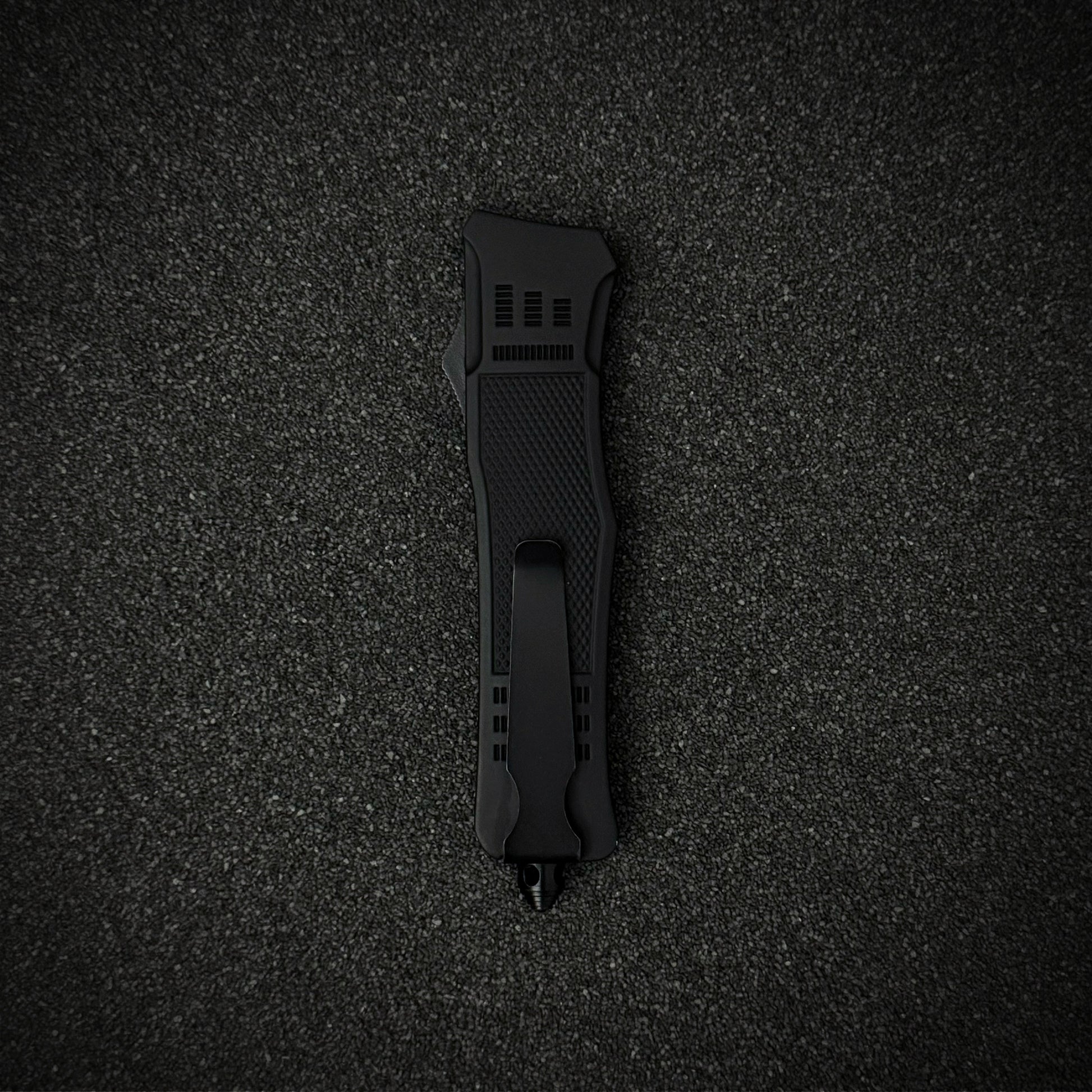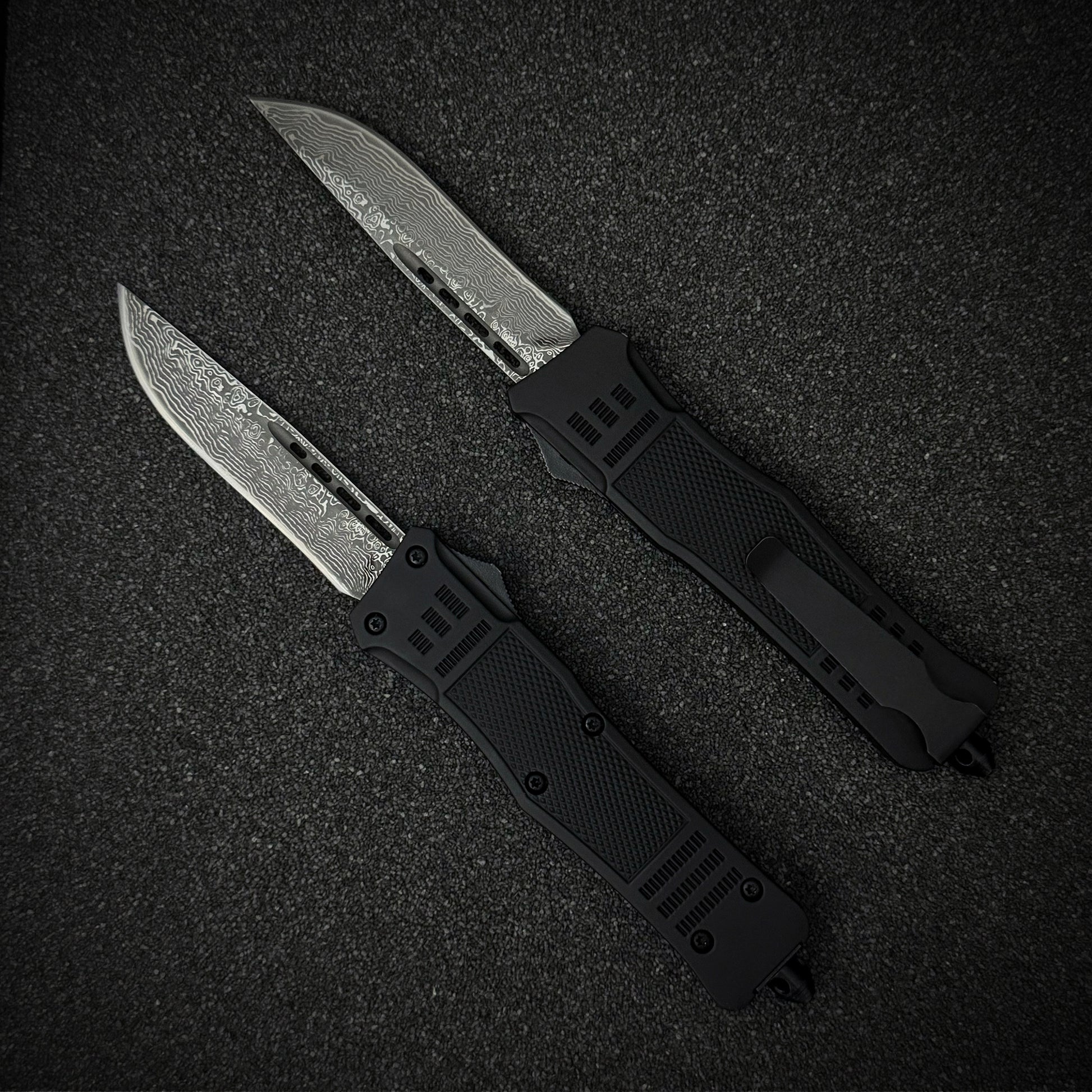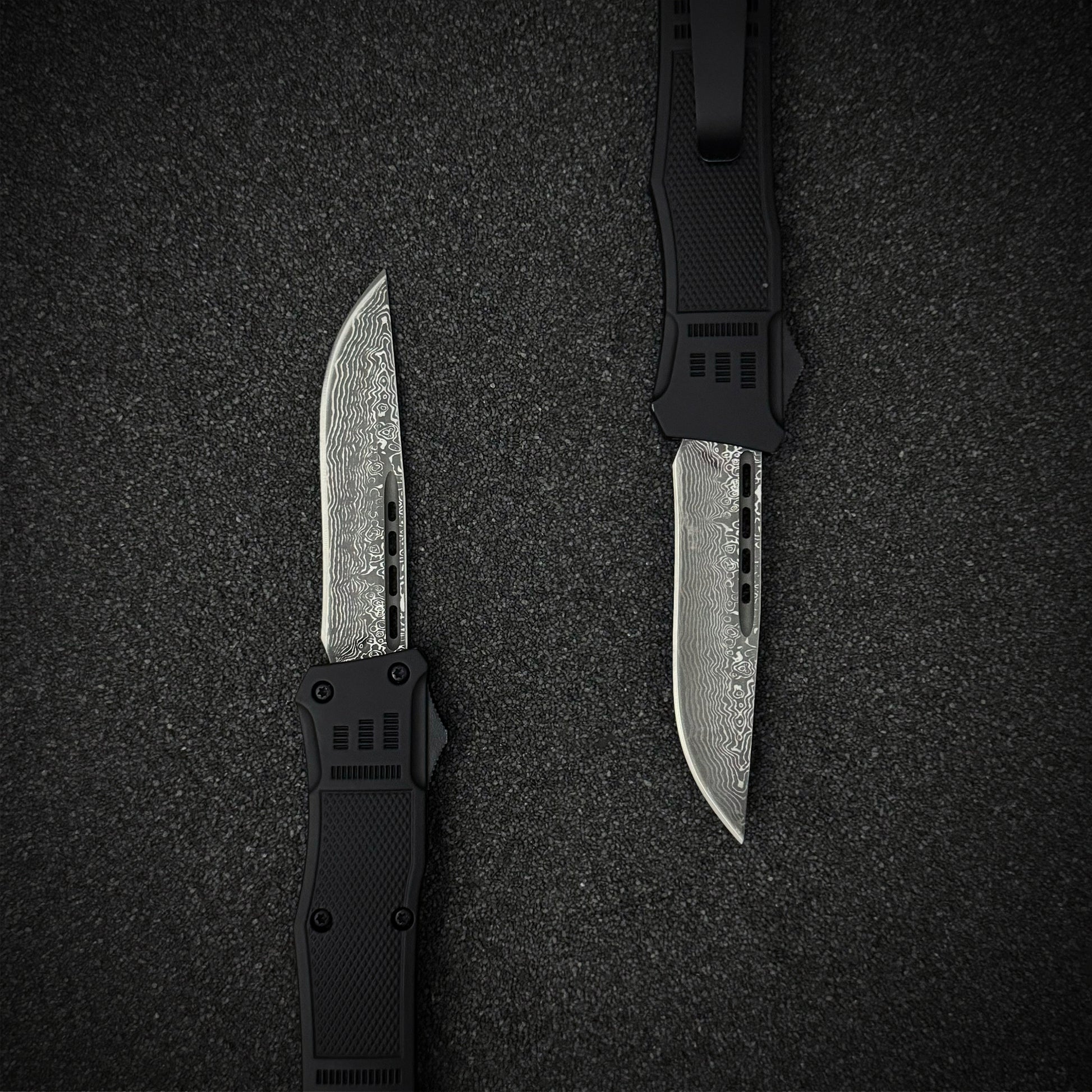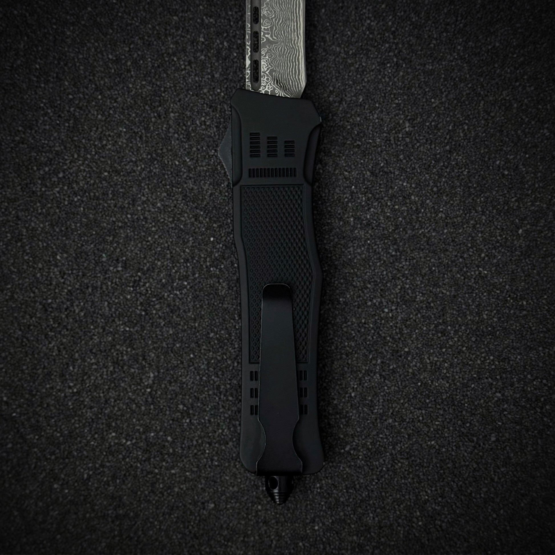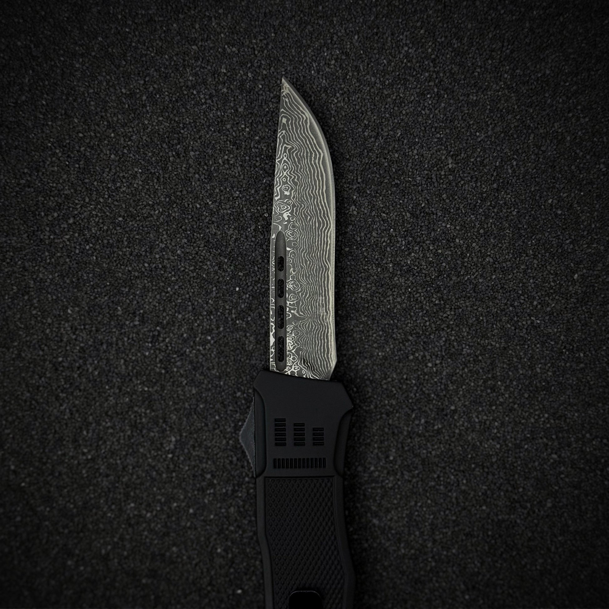 Introducing the Damout Strike knife, an upgraded version of our popular Blackout Strike model. With a sleek blacked-out aesthetic, the Damout Strike features a single-edge Damascus steel blade, providing unparalleled sharpness and durability. The symmetrical design ensures precise cuts, while the all-weather anodized zinc-aluminum alloy handle offers lightweight yet robust handling. Mechanically, the Damout Strike retains the smooth switch action of its predecessor, activated via the side trigger tab. Its ambidextrous design ensures easy opening for both right-handed and left-handed users. Despite its unique mechanism, the Damout Strike is engineered for safety, providing reliable performance without compromise. It comes equipped with a deep carry pocket clip and a stealthy carry case for discreet and convenient portability. Elevate your tactical game with the Damout Strike.