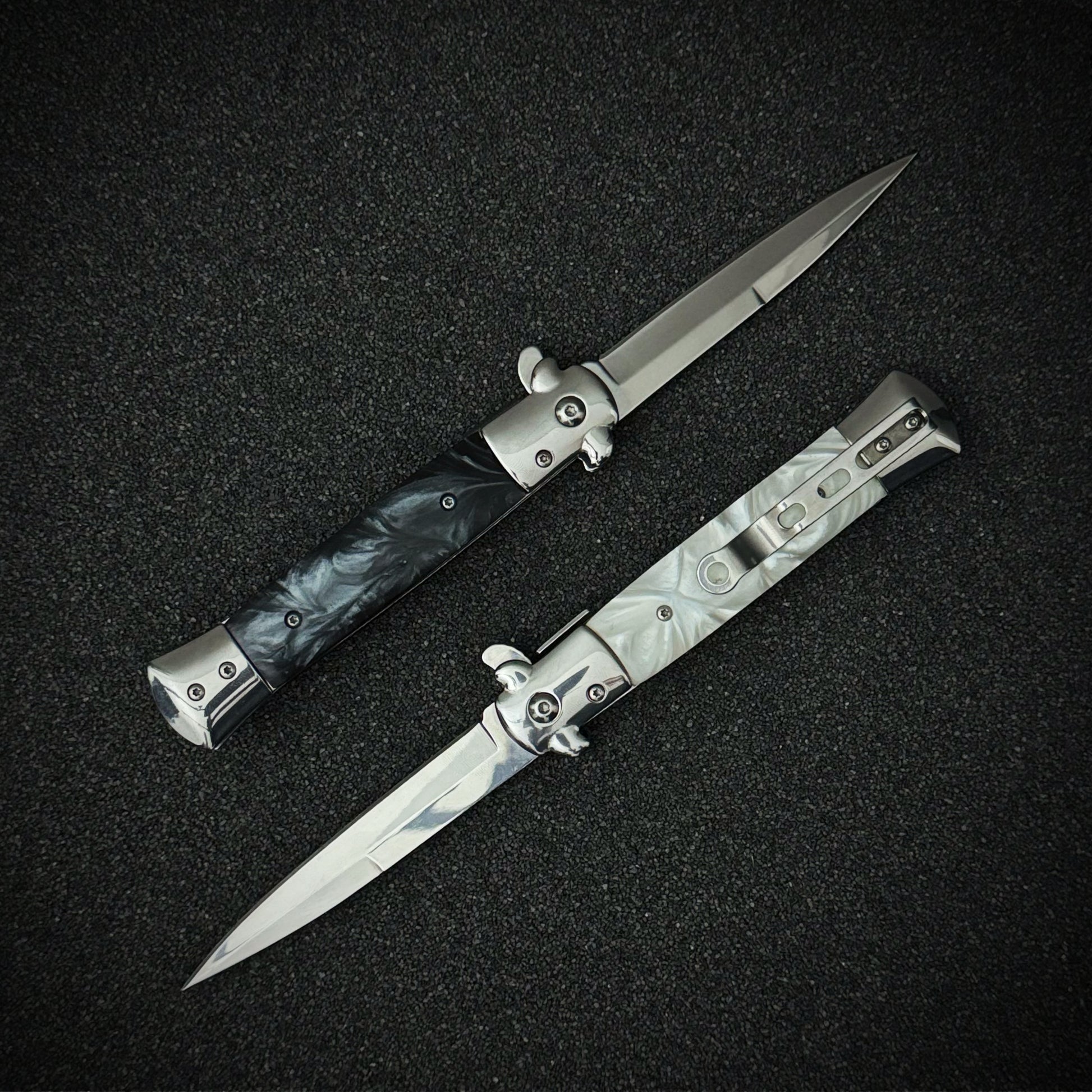 At 8.66 inches (22 cm) in total length, this knife features a 4-inch (10 cm) 440 stainless steel blade, built for precision, strength, and lasting sharpness. The resin or wood handle offers a secure, ergonomic grip, adding to its refined aesthetic. Weighing just 4.9 oz (140g) with a 58-59HRC hardness, the Timeless Stiletto delivers the perfect balance of style and function.